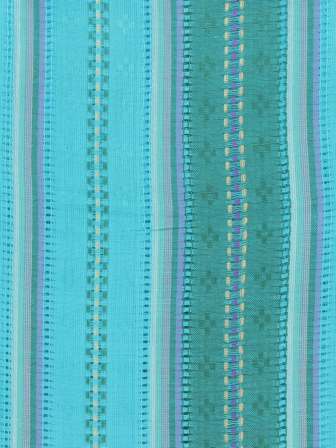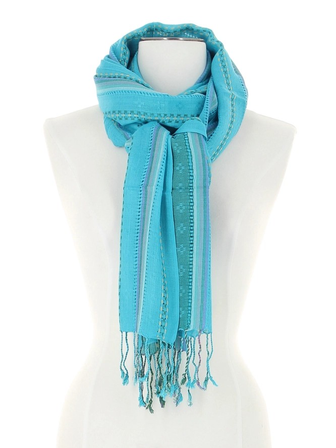 Hyvin pehmeä ja laadukas kaulahuivi turkoosinsinisessä värissä vihreillä raidoilla ja kirjonnalla.