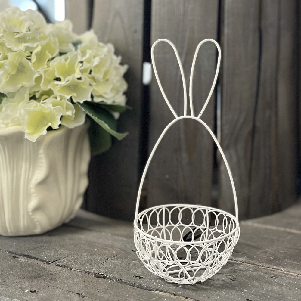 Metallinen pääsiäiskori, jossa on hauska pupunmuotoinen kahva, on upea pääsiäiskoriste!